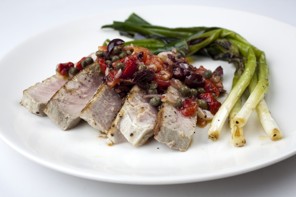 My latest dinner find! Wonderful, easy and seasonally perfect. Can swap out the tuna for swordfish or any steak fish. Make twice as many spring onions, they’re that good.